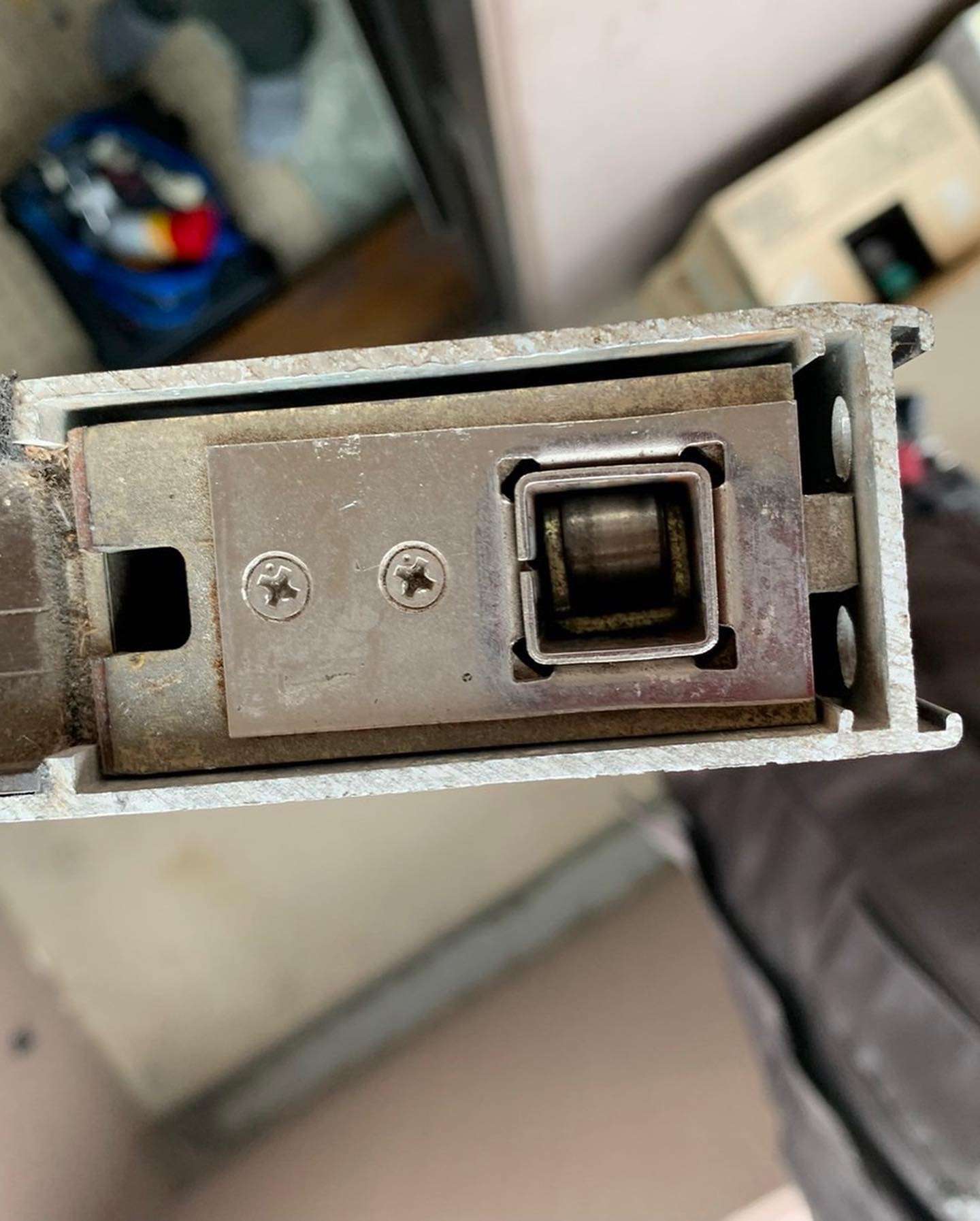 取り出し出来れば、ドアの戸先に穴を開けて部品をビス留め剤を塗ったビスで固定し無事完了致しました。